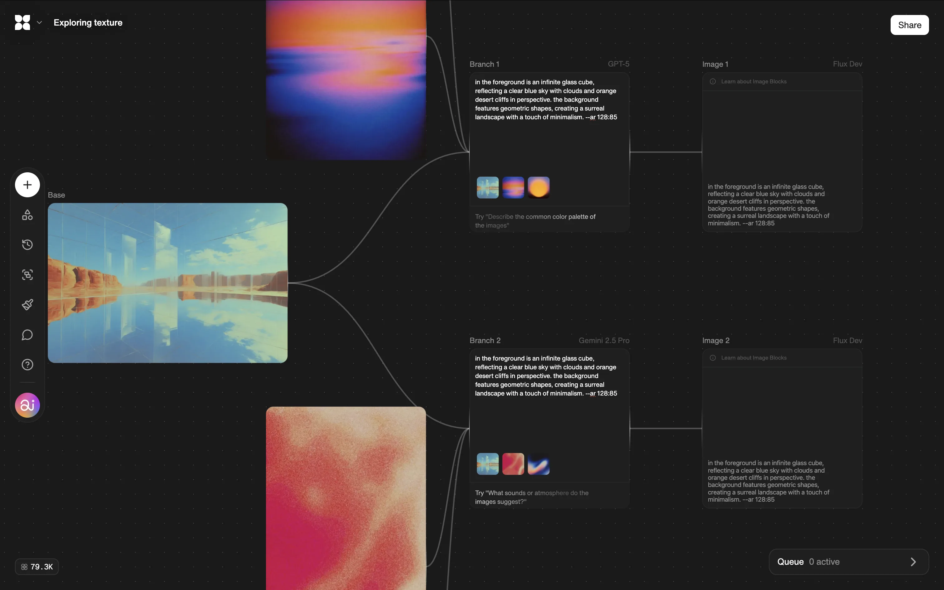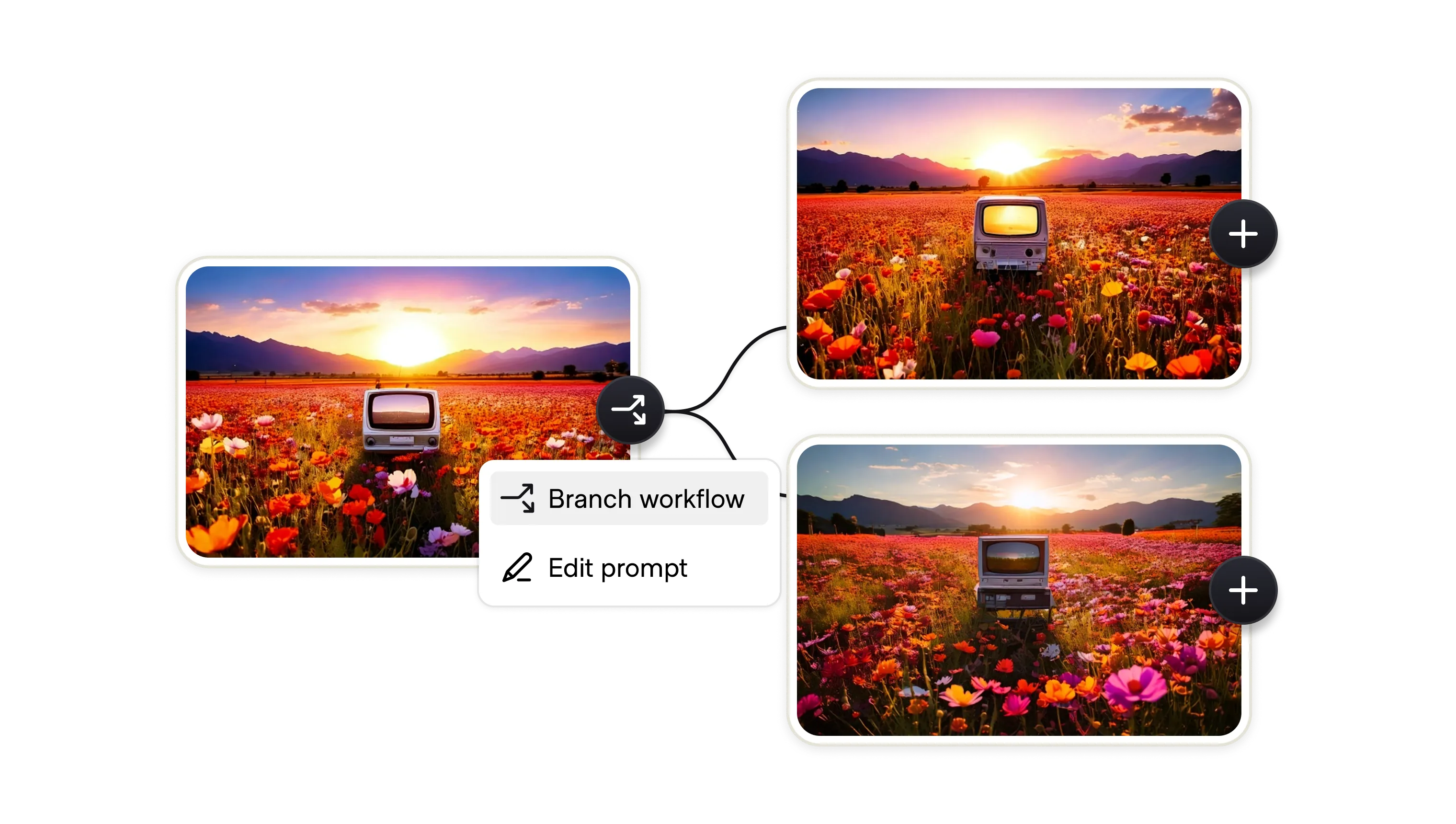 Branches allow users to create multiple paths of generation or exploration without losing the route back to the original. This can be helpful if users are not sure of exactly what outcome they are trying to reach, or if they want to play with different tokens, parameters, models, etc before converging on a path forward. This pattern also makes exploration auditable, since each path preserves inputs, settings, and outcomes.