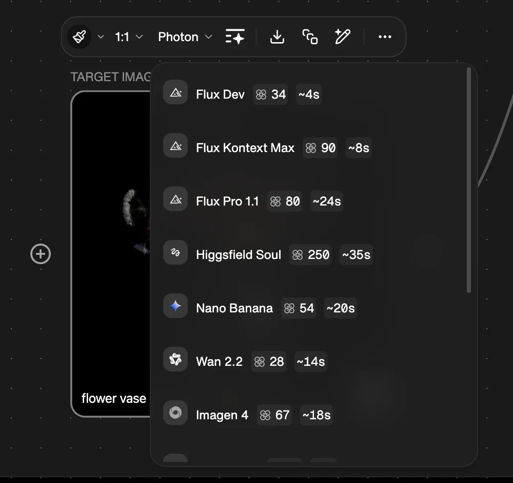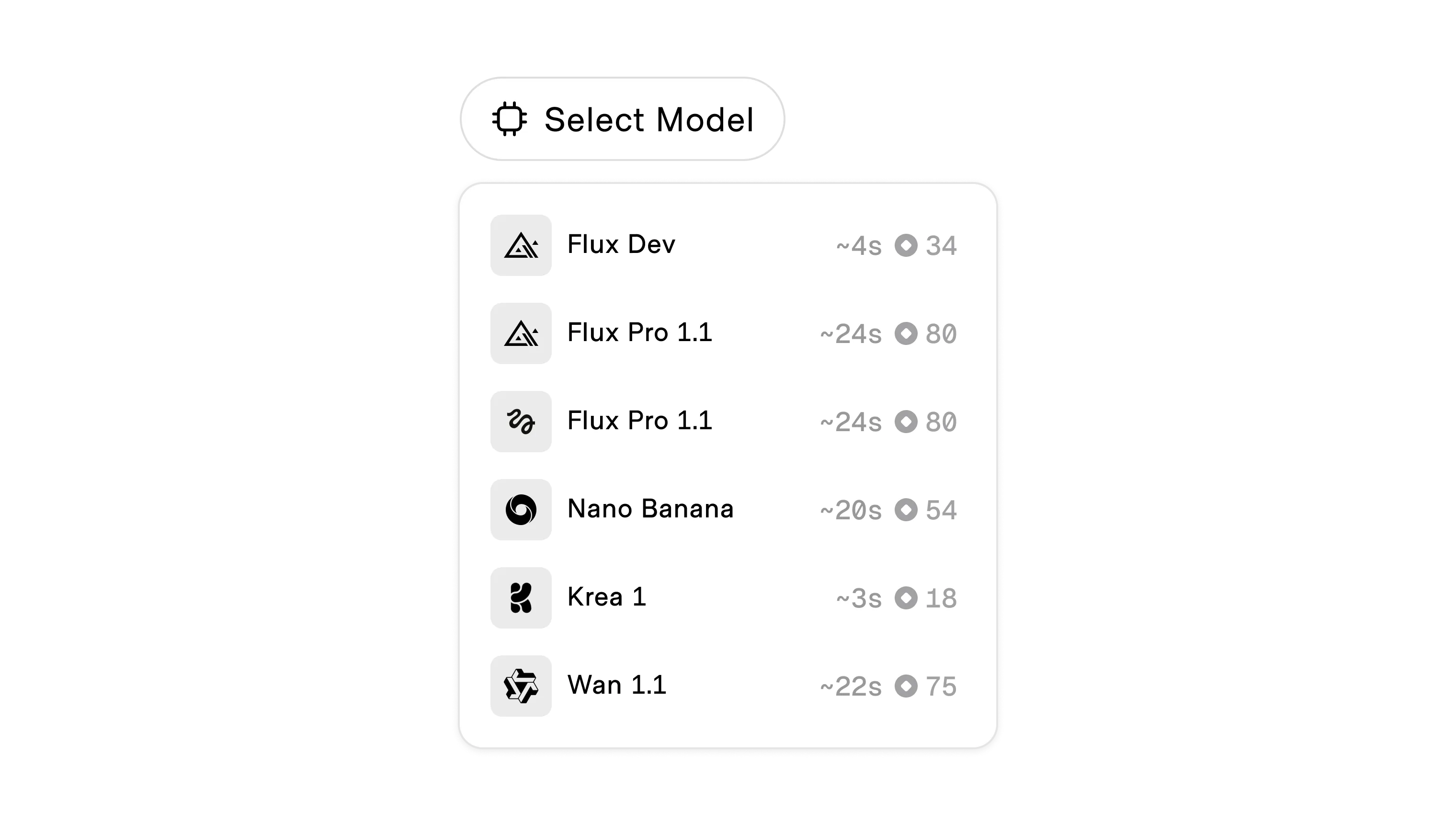 Transparent spend lifts the veil, helping users understand the relative costs of different prompt, parameter, and model combinations before anything runs. Estimated costs are shown beside key actions, and users can see in real time how changing their selection adjusts what they will "pay" in equivilent credits.