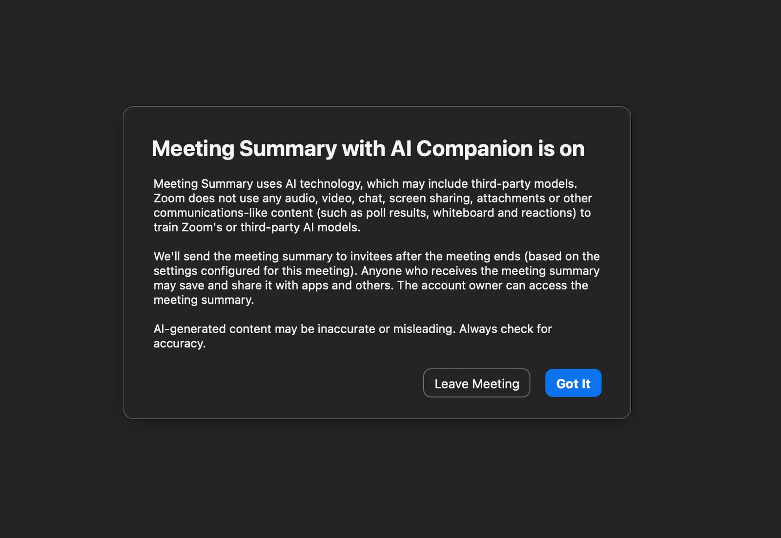 Zoom discloses when AI enters a meeting with a large overlay that takes over the screen