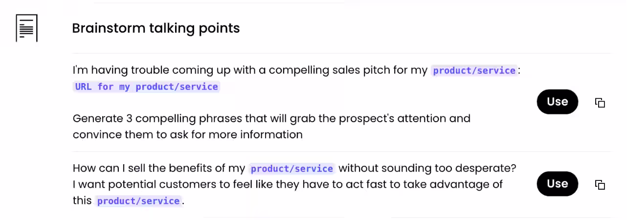 These are used in templates to unblock users getting started with content generation. Writer.com and Copy.ai are good examples of how this can be used to build a prompt library within your company. Details like tone of voice, audience, and so on only need to be captured once and put into the prompt template.