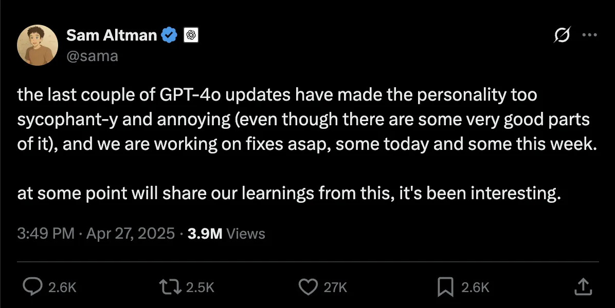A warm, approachable personality can make users feel comfortable and encourage exploration. A terse, mechanical one can signal reliability and speed. An overly sycophantic personality can encourage engagement but leads to unintended user behaviors.