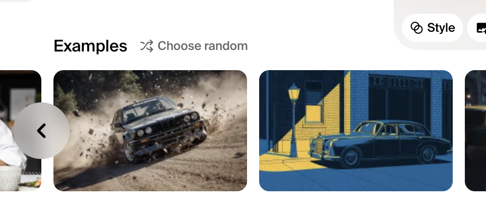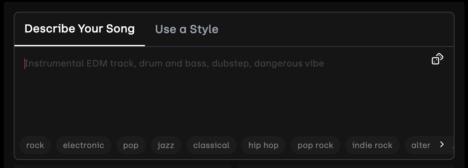 This pattern shows up most often in media tools. Audio and image generators commonly include a dice icon that fills the prompt box with a random idea or picks a random seed. Other users are randomizing styles, or suggestions and followups. The dice icon has caught on within the input box, offering a clear metaphor to users. However, interlocking arrows are also used, particularly for randomizers not directly related to building an input.