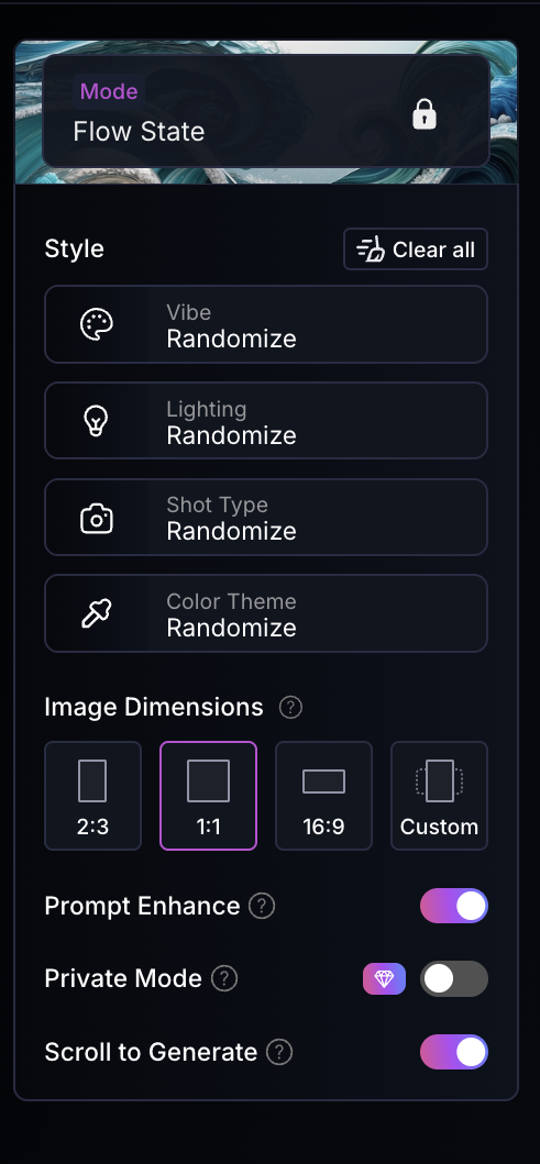 Using a randomizer is not intended to product results. Instead, this pattern operates as an on-ramp, showing how prompts, parameters, and saved styles work, and then inviting users to take control. By lowering the bar to entry, it turns curiosity into confident iteration.
